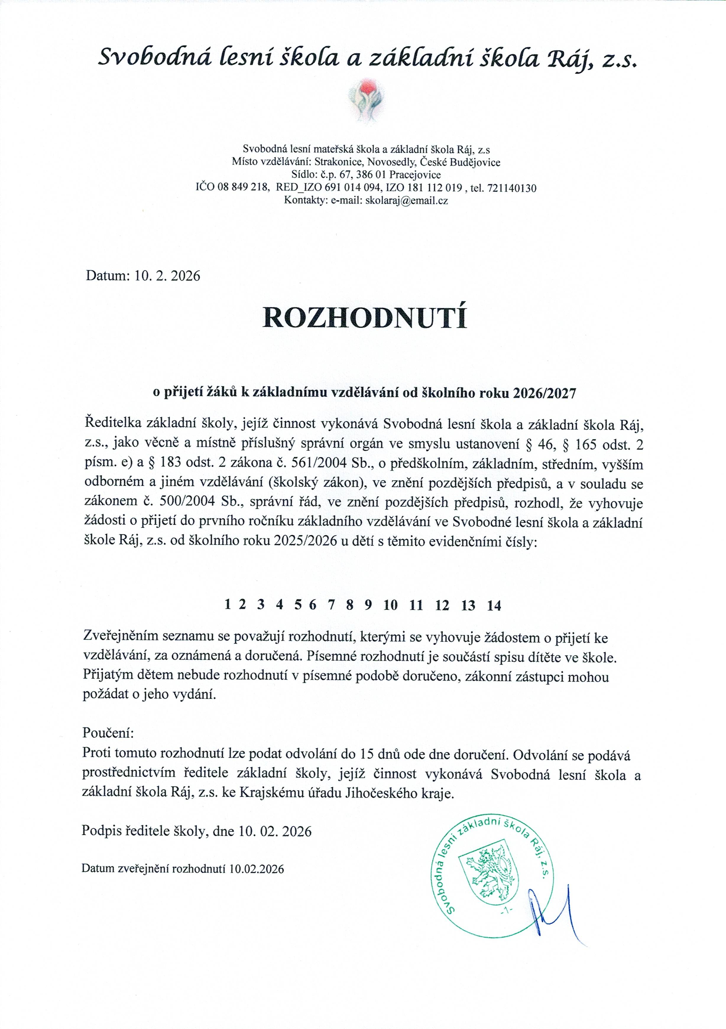 Pro rodiče zapsaných dětí je níže k nahlédnutí rozhodnutí s čísly přijatých dětí.